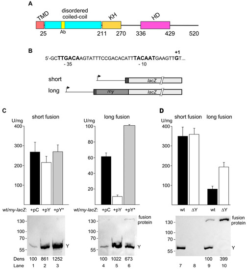 Effect of RNase Y on the activity of rny-lacZ fusions. (A). Domains composing B. subtilis RNase Y (520 aa) include an N-terminal transmembrane domain (TMD, aa 1–25), followed by a large region predicted to be disordered (aa~30–210), an RNA binding KH domain (aa 211–270), and a metal-chelating HD domain (aa 336–429) containing the conserved His/Asp motif required for RNase activity [2,24,48,49,50]. Ab indicates the position of the 12 aa peptide used for monoclonal antibody production. (B). Sequence of the sigma A-type promoter of the rny gene and schematic of the «short» and «long» translational rny-lacZ fusions; the −10 and −35 regions and the transcription start site (+1) are indicated. (C). β-galactosidase activity of short and long rny-lacZ fusions in strains containing either the empty control plasmid (pC) or plasmids expressing wild-type RNase Y (pY) or an inactive version of RNase Y (pY*) in the presence of inducer (0.2 mg/mL of tetracycline). All cultures were grown in the presence of inducer and the amount of RNase Y in the cell was determined by Western blot using an RNase Y-specific antibody (lower panels). The antibody also detected the long lacZ fusion protein. (D). β-galactosidase activity of long and short rny-lacZ fusions in the wild-type and rny deletion (∆Y) strain. RNase Y expression and the absence of RNase Y in the mutant strain was verified by Western blot (lower panel). Y = RNase Y. Numbers below the Western blots show relative densitometry readings (Dens) based on the control value arbitrarily set to 100 in each gel. Measurements refer to the bands corresponding to RNase Y, except in (D) where they correspond to the fusion protein.