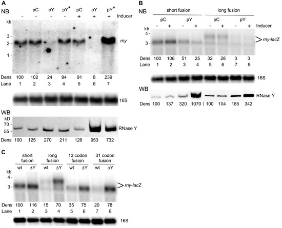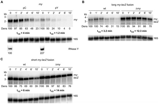 3.3. RNase Y Affects the Stability of Its Own mRNA