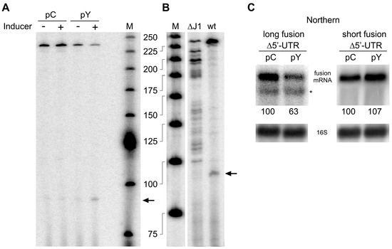 The half-life and the intracellular level of the short rny-lacZ mRNA was still affected in the ∆rny strain or by increased levels of RNase Y, albeit to a lesser extent than the long fusion mRNA. This implied that RNase Y might not only cleave within the rny open reading frame but also in the 5′ UTR. In order to identify such cleavages, we analyzed the short fusion mRNA by primer extension in strains containing the inducible RNase Y overexpression plasmid pHMD22 (pY) grown with or without inducer or the control plasmid. The amount of full-length cDNA (238 nt) was reduced in the RNase Y overexpressing strain, especially when grown in the presence of inducer (Figure 4A). Under these conditions, a ~90 nt cDNA accumulated as would be expected if RNase Y cleavage products were trimmed by RNase J1 to the point when the 5′ exonuclease encounters a ribosome bound to the translation initiation site. Since the ribosome protects about −15 to +15 nt on the mRNA with respect to the initiation codon [51], a 5′-end at position −15 would result in a cDNA of 88 nt which is in line with the detected ~90 nt cDNA product.