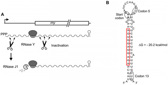Control of gene expression requires the instability of messenger RNA. In bacteria, mRNA half-lives vary from seconds to over an hour. The decay of mRNA generally follows an “all-or-none” pattern, implying that if control is to be efficient, it must occur at the rate-limiting initial step of the degradation process. Studies in Escherichia coli and Bacillus subtilis, two evolutionary very distant organisms, have provided essential knowledge on the initiation of mRNA decay by endonucleolytic cleavage that can be summarized by “different enzymes—similar strategies”. The crucial role of the endoribonucleases RNase E (E. coli) and RNase Y (B. subtilis) in producing short-lived decay intermediates is now clearly recognized [1]. In B. subtilis, RNase Y affects global mRNA stability by cleaving its substrates with an RNase E-like single strand-specific cleavage specificity [2]. The intracellular levels of a majority of transcripts are affected in RNase Y-depleted strains [3,4,5]. An alternative degradation pathway has been described for some mRNAs where the decay of the primary transcript is triggered by the RNA pyrophosphohydrolase RppH which generates a monophosphorylated intermediate that becomes vulnerable to 5′-exonucleolytic digestion by RNase J1 [6]. RNase J, comprising RNase J1 and J2 subunits, is a multifunction enzyme with both endonuclease and 5′ exonuclease activity; the latter activity being essentially a property of the J1 subunit that requires a monophosphorylated 5′-end (or 5′-OH) [7,8,9,10]. RNase J1 thus functions primarily in the 5′ exonucleolytic degradation of RNA decay intermediates generated by endonucleolytic cleavage or 5′-end conversion. Interestingly, a monophosphorylated RNA 5′ end also potentiates the endonucleolytic activity of RNase Y in vitro [2], but it is unknown whether this plays a significant role in the RNase Y-dependent degradation of RNAs in vivo.
