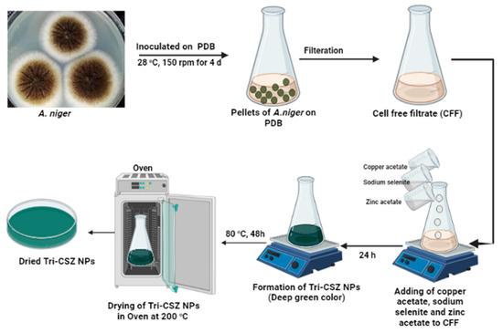 Tri-CSZ NPs were synthesized from A. niger AH1 biomass filtrate, which had previously been isolated, morphologically and genetically characterized, and deposited in a gene bank under the accession number MW680847 [50]. A. niger was inoculated into 250 mL Erlenmeyer flasks with 100 mL of Potato dextrose broth (PDB) medium. The inoculated flasks were incubated for 4 d, 150 rpm, at 28 °C 150 rpm. After removing the fungus’ mycelium from the culture medium using centrifugation (3500 RCF, 15 min, 4 °C), Whatman filter paper no. 1 was used for filtration to produce cell-free filtrate (CFF). Aqueous copper acetate, sodium selenite, and zinc acetate solutions were introduced in equal amounts to reaction vessels holding cell-free filtrate at a final concentration of 2.0 mM in order to create Tri-CSZ NPs. The reaction vessels were then incubated at 28 °C on a rotating shaker (150 rpm) without any light [51,52]. The presence of nanoparticles has been confirmed when the liquid turns a dark green color. The collected NPs were dried in an oven for overnight at 200 °C.