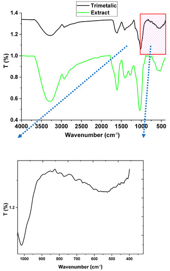 FTIR provide useful information about the biosynthesis efficiency and manipulation via tracking the functional groups changes. Figure 3 illustrates the FTIR spectrum of the fungal medium extract compared with the trimetallic spectrum. The fungal medium extract illustrated numerous functional groups that responded to the biosynthesis of the Tri-CSZ NPs, which presented the presence of hydroxyl groups and N-H groups as an overlapping of both functional groups at 3285 cm−1, which is the vibration stretching mode. The vibration stretching C-H bands were assigned as 2928 cm−1. Moreover, the bands at 1607, 1400, 1277, 1032, 771, and 589 cm−1 were attributed to C=O (amide I), C=O stretching and NH2 deformation, O-H in-plane deformation, C-O-C polysaccharide linkage, CH2 rocking, and OH out-plane bending, respectively [65]. In sum, in the functional groups of the fungal medium extract were observed the presence of active components working as caping and stabilizing agents for the formulation of nanoparticles. On the other hand, the spectrum of the Tri-CSZ NPs illustrates the functional groups involved in the formulation process of Tri-CSZ NPsin the range 4000 to 1000 cm−1. The hydroxyl group was shifted to 3295 cm−1 and the CH group band was split into two small groups at 2922 and 2832 cm−1. Moreover, the C=O band (around 1600 cm−1) intensity was decreased and the band at 1400 cm−1 was shifted to 1423 cm−1, while the polysaccharide band, CH2 rocking, and OH out-plane bending were shifted to lower frequencies. Herein, the FTIR spectrum of Tri-CSZ NPs in comparison with fungal filtrate spectrum was affirmed that the functional groups of the fungal filtrate significantly effect the biosynthesis of the nanoparticles. Additionally, the fingerprint region, which is less than 1000 cm−1, was observed in the bands relevant to the ZnO signal at 499 and 409 cm−1, with minor differences in comparison with the recordings in the literature [66,67] according to the integration between the trimetallic nanoparticle structures. Moreover, the CuO vibration bands were assigned at 619 and 515 cm−1 [68], while the SeNPs bands were recorded at 809 and 772 cm−1 [69]. Overall, the FTIR study obviously affirmed the role of the fungal medium extract in the formulation of Tri-CSZ NPs, as well as emphasized the evidence achieved by the XRD and UV–visible analyses. In this context, the physiochemical study using spectroscopy tools was confirmed and illustrated the formulation of the Tri-CSZ NPs.
