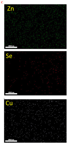 The topography included the SEM coupled with the EDX and mapping charts, as well as the TEM coupled with the SEAD diffraction. The SEM images are shown in Figure 4 with a low magnification, which confirm that the metallic particles aggregated into a traditional morphological appearance of metal and metal oxide. The high magnification SEM image illustrated the tetragonal pyramid shape. This was not the only key feature, as the particle appeared as compact layers with clear borders and edges. This behavior could due to the different metals used in the biosynthesis. Moreover, the mapping confirmed the presence of Zn, Se, and Cu atoms, with a nice complementary distribution. In addition, the EDX chart clarified presence of carbon, and oxygen atoms were recorded in the highest amounts as shown in Figure 4d. This is attributed to the presence of metal oxide that captured a high amount of oxygen in comparison with nitrogen and carbon. Otherwise, the metal percentages were arranged from the highest percentage to the lowest, as Zn, Cu, and Se, respectively. These observations illustrate the Tri-CSZ NP morphologies and competent structures. These illustrations are in excellent agreement with the obtained conclusions from the physiochemical analysis.