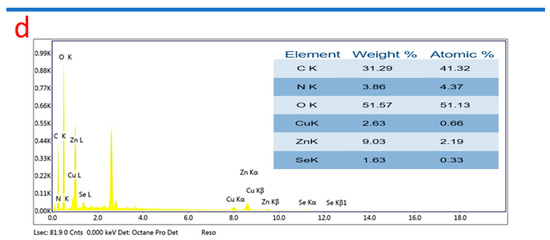 SEM images (a,b), mapping images of Zn, Se, and Cu atoms, (c) and EDX (d) of Tri-CSZ NPs.