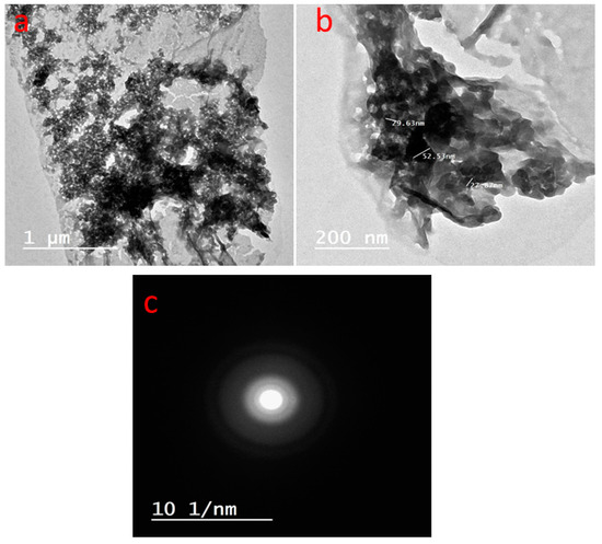 On the other hand, the TEM images prove the particle shape and size, as shown in Figure 5. The appearance of the Tri-CSZ NPs was allocated as homogenous particles with an average size of around 26.3 ± 5.4 nm and a shape similar to a stick, with ends showing a tetragonal pyramid shape. These findings affirmed the SEM findings. Otherwise, the SEAD diffraction showed eight faint rings that reflected both side’s four faces (Figure 5c). Moreover, these rings were sharp and separated, which reflects a high crystallinity.