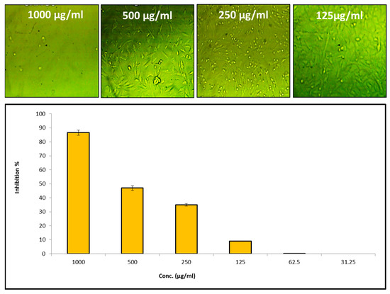 Cytotoxicity testing of the newly biosynthesized substances using in vitro testing of human normal cell lines is considered the initial step in determining whether or not these products are safe [70]. Figure 6 shows the results of an evaluation of the cytotoxicity of Tri-CSZ NPs using the Wi 38 normal cell line. According to the findings, the IC50 value for the Tri-CSZ NPs was 521 µg/mL. In general, the substance is considered to be noncytotoxic if the IC50 is less than 90 µg/mL [71]. Moreover, low concentrations of 62.5 and 31.25 µg/mL have no cytotoxicity on the Wi 38 normal cell line. This confirms that the prepared Tri-CSZ NPs are very safe if applied on live tissue.