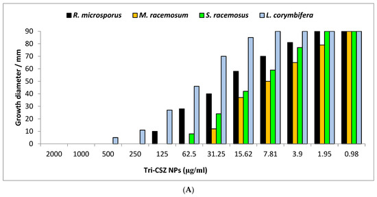 Silver nanoparticles (AgNPs), zirconium oxide nanoparticles (ZrO2NPs), and nanoemulsions (NB-201) are some of the latest antifungal medicines developed against various mucorales species. According to the fungal activity assays, silver nanoparticles enclosed in cyclodextrin can compete with mucorales, which inhibits the growth of M. ramosissimus [72]. Currently, there is still little knowledge on the connection between mucormycosis and the antifungal activities of nanoparticles. To combat the high mortality rates from mucormycosis in immunocompromised patients, the synthesis of novel antifungal medications is essential and urgent. In the current study, the antifungal activity of Tri-CSZ NPs was evaluated against fungi causing mucormycosis, such as M. racemosus, R. microsporus, L. corymbifera, and S. racemosum, as shown in Figure 7A. Results revealed that Tri-CSZ NPs showed promising antifungal efficacy against all fungal stains. Results also showed that M. racemosus is the most sensitive fungal strain tested, with an inhibition zone of 56 mm at a concentration of 2000 µg/mL. Moreover, it exhibited antifungal activity against R. microsporus and S. racemosum, but was lower against M. racemosus, where inhibition zones at 2000 µg/mL were 43 and 52 mm, respectively. On the other hand, L. corymbifera is the least sensitive among the other tested fungal strains (25 mm).
