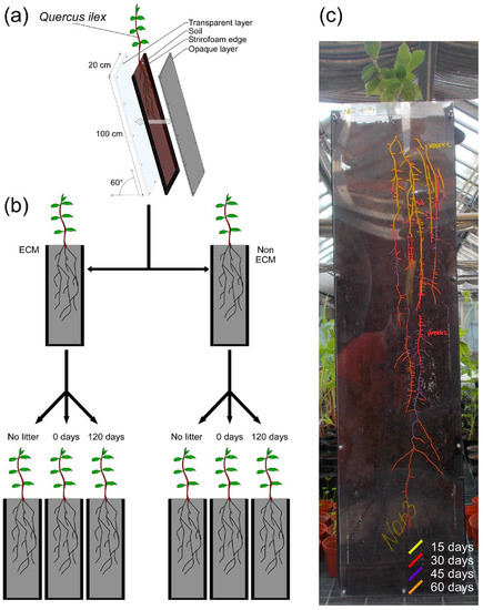 Representation of the rhizotron experiment. (a) Module structure; (b) experimental design and combination of soil litter amendments used in the experiment on Q. ilex seedlings with or without ectomycorrhizae of P. arrhizus. (c) In this example of the root system of a Q. ilex seedling growing in the rhizotron, roots were marked with differently coloured indelible pencils. Different colours represent the root visible after 15 days (yellow), 30 days (red), 45 days (violet), and 60 days (orange).