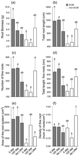The density of fine roots was similar between ECM seedlings; meanwhile, variation was observed for the non-ECM plants. The lowest level of fine root density was observed in the non-ECM seedlings growing in the decomposed litter, while the highest level was recorded in the same group of seedlings growing in the absence of litter (Figure 3f).