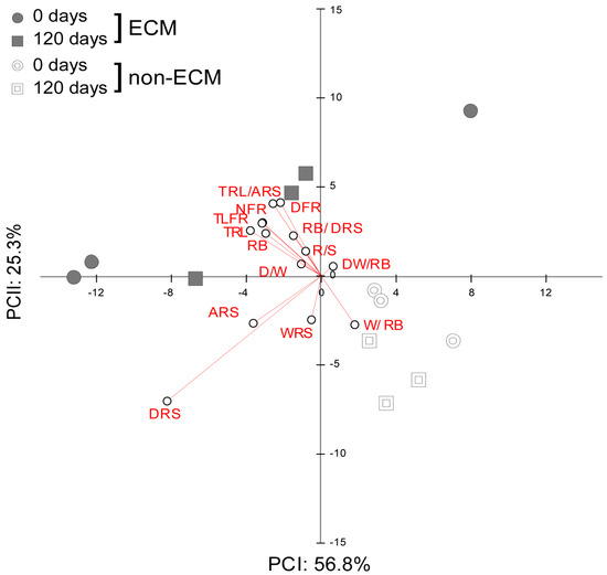 Principal component analysis (PCA) explains variation in root system associated with ectomycorrhizal and non-ectomycorrhizal Q. ilex seedlings growing with different litter regimes. In the plot, the trajectories of associated loadings are shown for each sampling date.