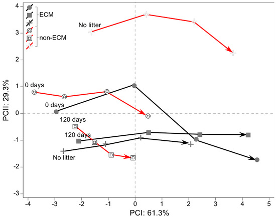 Moreover, nine parameters were measured to obtain information on the shape of the root system and its strategy of proliferation in the soil over time. The data was reduced using Principal component analysis (PCA), explaining around 99.6% of the total variance in the data (PCI: 61.3% and PCII: 29.3%). The multivariate analysis showed that ECM plants are generally more correlated with the development of a wider root apparatus and a larger area of the root system. The same strategy is assumed by litter-enriched non-ECM plants that develop a wider root apparatus but have a lower correlation because of the scant growth. A complete inverse strategy is developed in non-ECM plants growing without litter, which have a higher depth-width ratio, a higher density of fine roots, and a deeper root system (Figure 5).
