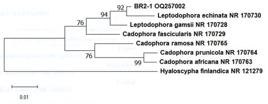 The above method was employed to isolate more than 20 pure cultures of fungi from the roots of the studied plants. We studied their morphological and physiological traits, which allowed us to initially remove the samples that did not correspond to ErM fungi. One of the isolates was identified as a widespread phytopathogen, Penicillium thomii. Based on available data from the literature on macro- and micromorphology with regard to the nature of growth in dense media, we selected only 10 isolates from the total number of obtained pure cultures. All of them showed slow growth, the colonies were of dark color, and the mycelium was pigmented. BR2-1 isolated from lingonberry roots was chosen as the main study object. This strain formed colonies with a smooth white edge and a brown colored middle; the colony reverse and the exudate were black (Figure 2b) [], and the average daily growth rate in Czapek-Dox medium was 0.4 mm/d. The BR2-1 colonies grown on potato dextrose agar had a wider white margin (Figure 2c), while in maltose–dextrose medium, they formed aerial mycelium (Figure 2a) stained olive brown. The strain hyphae were stained dark gray, were segmented and contained numerous vacuoles (Figure 2d–f). These traits are typical of many nonpathogenic endophytic fungi referred to as ‘dark septate endophytes’ (DSE), because they exhibit melanized mycelium and are mainly associated with plant roots []. Phylogenetic analysis of the ITS region sequence of the isolate assigned BR2-1 to the fungal genus Leptodophora. Sequence similarity was identified via two representatives of the genus, L. echinata Koukol et Macia-Vicente (98.62 percent homology) and L. gamsii Koukol et Macia-Vicente (98.28 percent homology), which were isolated from the roots of Central European plants []. These species were previously assigned to the genus Cadophora. The genus Cadophora is paraphyletic and most of its representatives form endomycorrhizae with various plant species, including heather plants []. Based on the analysis of new molecular data, L. echinata and L. gamsii were segregated into a separate genus []. Figure 3 presents a phylogenetic tree indicating the position of Leptodophora sp. BR2-1 relative to other fungi that form mycorrhizae with plants of the genus Ericaceae. The sequence was deposited in the GenBank database under accession number OQ257002.
