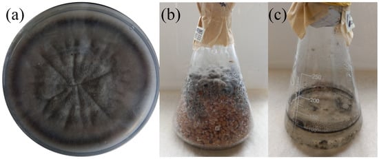 Cultivation of BR2-1 in different media. (a) Czapek-Dox agar medium, (b) boiled grain (7 d), (c) Czapek-Dox liquid medium (7 d).