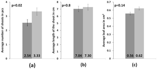 Differences between the control group of microclones (dark gray) and the experimental group (light gray) (a) in the average number of shoots, (b) in the average length of shoots and (c) in the average leaf area.