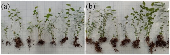 Highbush blueberry microplants var. Nord Country after 3 weeks of adaptation: (a) control plants, (b) plants inoculated with mycelium and spores of Leptodophora sp. BR2-1.