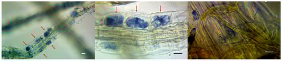 Stained micropreparations indicating endomycorrhizae in the roots of lingonberry plants. Phase contrast microscopy. Arrows show the presence of mycorrhiza formation in the epidermis cells. Scale is 10 µm.