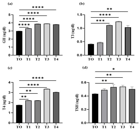 Quantification of serum growth and thyroid hormones. The quantity of growth and thyroid hormones in serum was determined at the end of the experimental trial of three months. (a) The concentration of growth hormone (GH), (b) the amount of Triiodothyronine (T3), (c) the amount of thyroxine (T4), and (d) the thyroid stimulating hormone (TSH). Data represent the mean ± SD of three independent replicates. Significant differences were examined using one-way ANOVA with a post hoc Tukey’s test, and asterisks indicate (* p < 0.05; ** p < 0.01, *** p < 0.001, and **** p < 0.0001) significant differences.