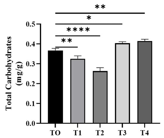 Carbohydrates values were significantly lower in the probiotic-treated groups T1 and T2 in comparison to the T0 group (0.3257 ± 0.008273 and 0.2637 ± 0.009711 in fish, respectively), and significantly higher values were recorded in the T3 and T4 groups (Figure 2).