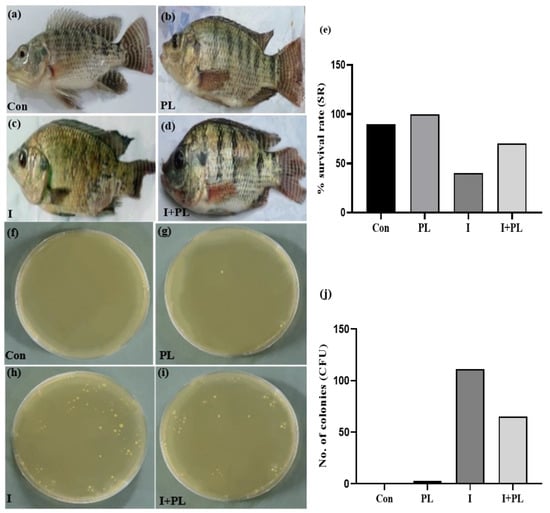 After infection, fish were monitored for gross pathological changes. In the Con and PL groups, no pathological signs were observed in the whole body (Figure 3a,b). In the I group, fish indicated pathological signs starting at three dpi, notable eye redness, gill damage, hemorrhage, tail rupturing ulcerative lesions, trunk bleeding, scale loss, swelling, and red ulceration (Figure 3c). In the I + PL group, body color, body swelling, tail rupturing, and gill lesions were shown (Figure 3d). The survival rate of the I + PL group was high as compared to the I group after the A. hydrophila challenge. The Con and PL groups showed a higher survival rate than the challenge groups (Figure 3e). At the end of the challenge assay, the bacterial load was measured in fish muscle. Circular, smooth, and yellowish colonies of A. hydrophila were produced on nutrient agar, and the number of colonies was counted and found to be higher in the I group followed by the I + PL group in comparison to the Con and PL groups (Figure 3f–j).