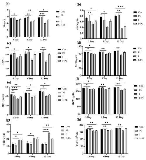 Hematological parameters were assessed after 3, 6, and 12 dpi. Significant differences (p < 0.05; p < 0.01; and p < 0.001) in Hb (Figure 4a), RBCs (Figure 4b), Hct (Figure 4c), MCH (Figure 4d), MCHC (Figure 4e), MCV (Figure 4f), and PLT (Figure 4h) were found in the I, and I + PL groups. However, WBC was significantly (p < 0.05) high in the I and I + PL groups as compared to the Con and PL groups (Figure 4g).