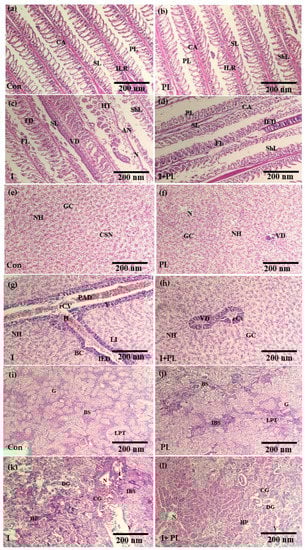 In the liver of Con fish, no histological changes were observed. Hepatocytes, with spherical nuclei and polygonal shapes arranged in different tubules, were identified (Figure 5e). The PL group showed vasodilation in the sinusoids, necrosis, cytoplasmic degeneration, and infiltration of edematous fluid (Figure 5f). The severe pathological changes observed in the I group were caused by A. hydrophila in the liver of the nuclei and severe dilation in sinusoids with lipid vacuoles, which caused pyknotic nuclei, cytoplasmic degeneration, intravascular, hemolysis, and hemosiderin accumulation. Moreover, coagulate-type cellular necrosis, congestion of sinusoid hypertrophy, cytoplasmic hyperplasia, and vacuolization were also seen (Figure 5g). In the I + PL group, histological alterations were observed, including leukocyte infiltration, melano-macrophage aggregation, hypertrophy, hyperplasia, and hemosiderin accumulation. Variations in tissue structure, such as rupturing of the central vein, were also observed (Figure 5h).