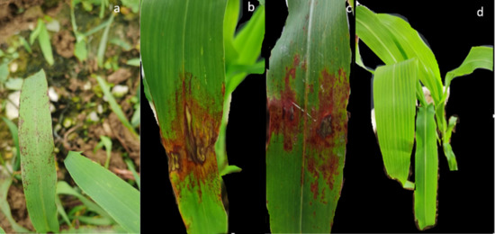 Natural field symptoms of sorghum leaf disease (a); Symptoms 6 days after artificial inoculation (b); Symptoms 10 days after artificial inoculation (c); Control (d).