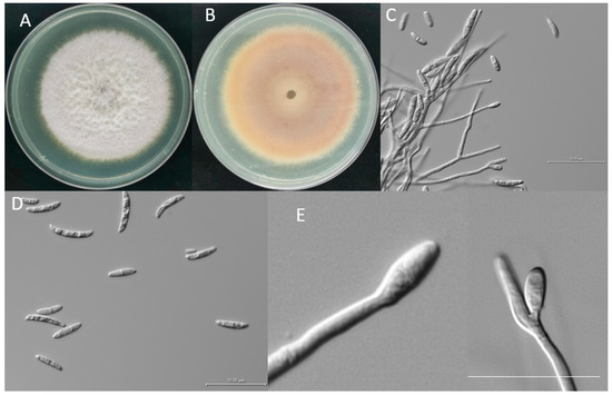 The morphology of pathogen grown on PDA medium for 5 days (A,B); conidiophores (D); the structure that produces conidia (C,E). Scale bar is 50 μm.