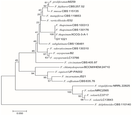 For phylogenic analysis, the phylogenetic tree was constructed by using the combined sequences of ITS, β-TUB and TEF-1α in MEGA 7.0 software with bootstrap values based on 1000 replications, as shown in Figure 3, including 1 species of Fusarium thapsinum, 18 other referred isolates of Fusarium species, and F. delphinoides was an outgroup species (Table 3). The sequences of representative isolates of ITS, TUB2, and TEF-1α were aligned with the corresponding sequences of different species of Fusarium obtained from NCBI’s GenBank nucleotide database.