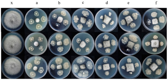 The antagonistic bacteria were tested in vitro for the inhibitory effect against F. thapsinum. (a) Paenibacillus polymyxa; (b) Bacillus velezensis; (c) Bacillus amyloliquefaciens; (d) Bacillus subtilis; (e) Bacillus megaterium; (f) Bacillus licheniformis; (x) Control.