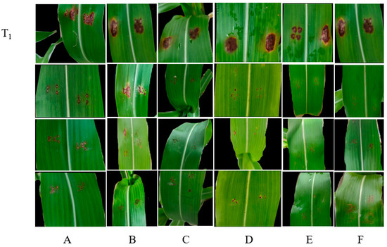 In vivo antifungal effects of aseptic filtrate and natural products on disease extension in sorghum caused by F. thapsinum. (A) (Bacillus amyloliquefaciens), (B) (Bacillus velezensis), (C) (Paenibacillus polymyxa), (D) (2-allylphenol), (E) (carvacrol), (F) (honokiol), (T1) (control).