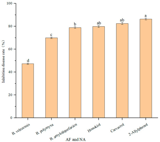To confirm the effect of the aseptic filtrate and natural products on F. thapsinum in vivo, the aseptic filtrate of Bacillus amyloliquefaciens, Bacillus velezensis, Paeni Bacillus polymyxa, and the natural products 2-allylphenol, carvacrol, and honokiol were used to alleviate the severity of sorghum decay caused by F. thapsinum (Figure 5). AF (aseptic filtrate); NA (natural antifungal agent). Bacillus amyloliquefacien, Bacillus velezensis, and Paenibacillus polymyxa are all at 100 mL L−1, 2-allylphenol, carvacrol, and honokiol are 7, 24, and 46 mg L−1, respectively. Disease inhibition rate was measured after treatment with three antagonistic bacteria aseptic filtrates and three natural products. After 15 days, the spots were measured. The disease inhibition rates were 78.97%, 55.62%, and 69.51% for Bacillus amyloliquefaciens, Bacillus velezensis, and Paenibacillus polymyxa, respectively, and the disease inhibition rates were 87.29%, 85.23%, and 80.13% for 2-allylphenol, carvacrol, and honokiol, respectively. Bacillus amyloliquefaciens, Paenibacillus polymyxa, 2-allylphenol, carvacrol, and honokiol have significant inhibitory effects (Figure 6). The lesion area was measured using ImageJ software (National Institute of Health, Bethesda, MD, USA).