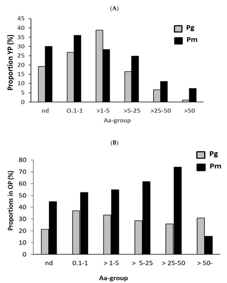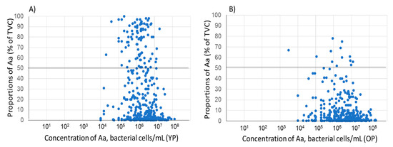 When the proportion and concentration of A. actinomycetemcomitans in the individual samples were compared, no overall relation could be observed, neither for the samples collected from young patients nor from old patients. (Figure 3A,B). However, in YP, the number of samples with a high proportion (>50%) was higher compared with that in the samples from the OP.