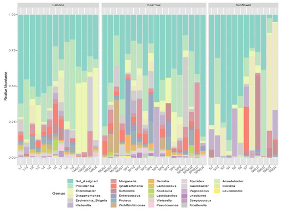 - Park, R.; Dzialo, M.C.; Spaepen, S.; Nsabimana, D.; Gielens, K.; Devriese, H.; Crauwels, S.; Tito, R.Y.; Raes, J.; Lievens, B.; et al. Microbial communities of the house fly Musca domestica vary with geographical location and habitat. Microbiome 2019, 7, 147. [Google Scholar] [CrossRef]