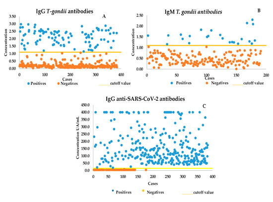 A total of 384 serum samples from patients with IgG antibodies against S1/S2 SARS-CoV-2 were previously analyzed for anti-T. gondii antibodies (IgM and IgG ELISA) to determine their coinfection with SARS-CoV-2. This study demonstrated that 105/384 (27.34%) were positive for anti-T. gondii IgG. Anti-T. gondii IgM was found in 191 patients, and 26/191 (13.6%) were positive.