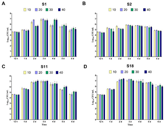 The growth of the four selected bacterial isolates ((A), S1; (B), S2; (C), S11; and (D), S18) determined by the viable count method (log10 CFU/mL) after different time intervals (1–7 days) of bacterial growth in minimal salt media supplemented with different concentrations of diclofenac (10, 20, 30, and 40 mg/L) as a single carbon source. The bars represent mean ± SD of three independent replicates.