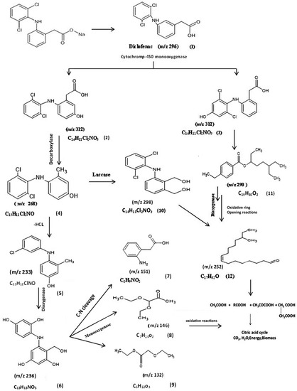 - Marco-Urrea, E.; Pérez-Trujillo, M.; Cruz-Morató, C.; Caminal, G.; Vicent, T. Degradation of the Drug Sodium Diclofenac by Trametes Versicolor Pellets and Identification of Some Intermediates by NMR. J. Hazard. Mater. 2010, 176, 836–842. [Google Scholar] [CrossRef]