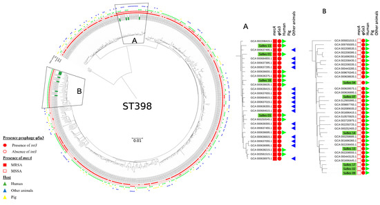 Phylogenetic tree using the Bayesian approach of 443 S. aureus ST398 from NCBI and the 11 isolates included in the current study (isolates highlighted in green). MRSA isolates were clustered with animal and human isolates (A), whereas MSSA isolates were clustered with only human isolates (B). Eleven isolates in the present study harbored φSa3 prophage.