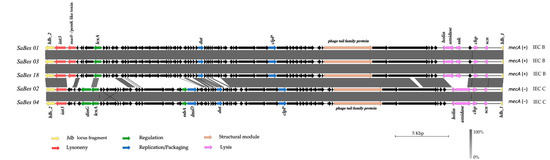Structural comparison of the genomes of φSa3 prophages in ST398 MSSA and MRSA isolates. The red, green, blue, purple, and orange arrows indicate the different functional modules of the prophage. The immune evasion cluster is included in the lysis module in purple. All MSSA and MRSA isolates, respectively, had the same φSa3 prophages. Only the genome of φSa3 prophage of three MRSA and two MSSA are shown.
