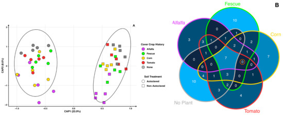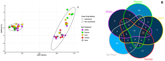 - DiLegge, M.J.; Manter, D.K.; Vivanco, J.M. Soil microbiome disruption reveals specific and general plant-bacterial relationships in three agroecosystem soils. PLoS ONE 2022, 17, e0277529. [Google Scholar] [CrossRef]