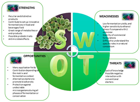 Figure 1. Identification of key strengths (S), weaknesses (W), opportunities (O) and threats (T) related to the use of non-Saccharomyces yeasts (NSYs) in fermented foods and beverages.