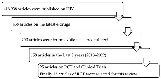 There were altogether four drugs approved in the search period that were reviewed, and 13 articles of randomised controlled trials (RCTs) were collected. The details of data extraction are presented in Figure 1. The four drugs approved during the search period are Cabenuva (a combination of extended-release injectable suspension of cabotegravir and rilpivirine) in 2021, Rukobia (an extended-release tablet of fostemsavir) in 2020, Pifeltro (tablet doravirine), and Trogarzo (a parenteral formulation of ibalizumab-uiyk) in 2018 by the US-FDA. These drugs are administered in combination with other antiretroviral(s), for the treatment of HIV infections. All the authors independently extracted the relevant information from the RCT studies that fulfilled our inclusion criteria and any disagreements were resolved by consensus. The information extracted included the trial phase, region, conditions of subjects (viral load, CD4 count, and opportunistic infections), and outcome measures. This information was gathered and summarised into paragraphs, introducing each anti-HIV drug comprehensively.
