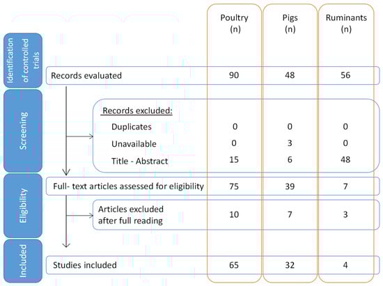 Our literature search flow diagram (Figure 1) shows that 90 controlled trials or systematic reviews were identified in PubMed for poultry, 48 for pigs and 56 for ruminants. Of these, no duplicates were identified and excluded. Three articles were unavailable and were therefore excluded. Using the PICOS table (Table 1) and based on titles and abstracts, 15 articles were excluded for poultry and 6 for pigs. For ruminants, 48 controlled trials were excluded; most of these articles focused on modulation of the human intestinal microbiota in the case of intolerance or allergy to cow’s milk. The remaining 75 articles for poultry, 39 for pigs and 7 for ruminants were retained, but, after full reading, 10, 7 and 3 articles were excluded, respectively, based on the PICOS table. Finally, for this review, 65 articles were eligible for poultry, 32 for pigs and 4 for ruminants. All included studies for poultry were published from 2004 to 2021. For pigs, the assessed studies were published from 2006 to 2021. Finally, studies on ruminants were published between 2018 and 2021.