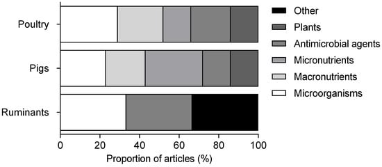 In pigs, the micronutrients family was the most commonly studied, with 29% of controlled trials. Minerals were the most represented group in this family. Microorganisms and derivatives accounted for 23% of the articles on pigs, the majority related to probiotics. Macronutrients were also studied in 20% of the articles, principally prebiotics (Figure 2).