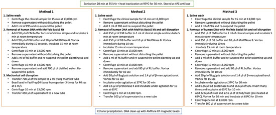 Description of the three protocols tested for DNA extraction directly from clinical samples. Samples containing more than 1 mL were worked in different vials and the pellets were collected together after the saline washing step. Method 1 was described by Votintseva et al. [1,2].