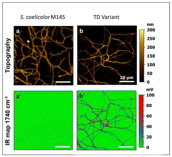 - Deniset-Besseau, A.; Prater, C.B.; Virolle, M.J.; Dazzi, A. Monitoring TriAcylGlycerols Accumulation by Atomic Force Microscopy Based Infrared Spectroscopy in Streptomyces Species for Biodiesel Applications. J. Phys. Chem. Lett. 2014, 5, 654–658. [Google Scholar] [CrossRef]