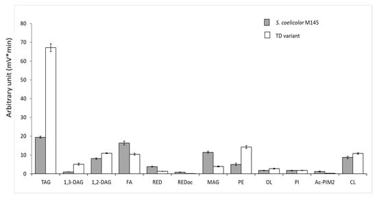 3.1. A Pale-Blue Variant of S. coelicolor Weakly Produces ACT and RED and Has a High Triacylglycerol and Phosphatidylethanolamine Content