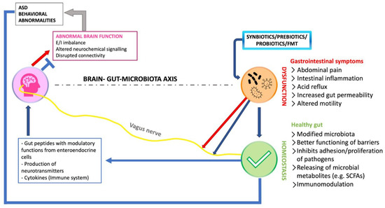 Autism spectrum disorder (ASD) is a group of neurodevelopmental disorders characterized by a variety of deficits in behavioral areas such as social communication, social interaction, and repetitive activities [1]. These clinical diagnostic criteria can be seen in children as early as one year old and are often associated with lifetime difficulties [2]. ASD is associated with a higher prevalence of other medical conditions, such as gastrointestinal (GI) symptoms, seizures, anxiety, disordered sleep, and immune dysfunction, in addition to the spectrum of developmental impairments described; these conditions may have an impact on individual and family quality of life, as well as increase the cost and complexity of medical care [3,4,5]. GI problems, in particular diarrhea, constipation, and abdominal discomfort, are commonly reported in children with ASD, and growing data suggest that GI comorbidity may have downstream consequences on problematic behaviors in ASD [6]. A relationship between the gut and the brain has long been suspected, but research in recent years has begun to investigate the gut–brain interaction in ASD, leading to the identification of links between the gut microbiota (GM) and the pathophysiology of ASD [7]. Microorganisms (mostly bacteria, but also fungi, viruses, archaea, bacteriophages, and protozoa) that live in the lower GI tract, particularly the small intestine and colon, are referred to as the gut microbiome [7,8]. Individuals with ASD have altered gut bacteria profiles when compared to neurotypical controls, suggesting a potential role for GM in ASD [9,10,11]. The influence of GM on the GI system has been widely established, with GI motility, intestinal epithelial permeability, and mucus production all being influenced [12]. The severity of GI symptoms in ASD patients has been linked to derangements in the GM, such as during antibiotic administration. It was also discovered that if the antibiotics were withdrawn, the GI and behavioral problems resolved [13,14]. This offers new study opportunities for the function of GM-altering medicines such as probiotics as a possible treatment alternative. Recent research suggests that probiotics can help with a variety of psychological symptoms, including depression and anxiety [15,16]. The microbiota–gut–brain axis (MGBA) is thought to be a complex interaction between the brain and the GI tract [17]. The gut bacteria play a crucial role in controlling this gut–brain axis, and dysbiosis can have a deleterious impact not only on the GI tract but also on psychiatric symptoms [18,19]. Food restrictions and supplements have been studied in the therapy of ASD symptoms [20]. Apart from probiotics, the effect of prebiotics on the gut flora should not be overlooked. Nondigestible carbohydrates are one example. Exclusion diets and prebiotics were recently studied in children with ASD, with results showing substantial changes in GM composition and metabolism, as well as improvement in GI and behavioral symptoms [21,22]. A recent study found that transplanting gut microbial communities from ASD patients to wild-type germ-free mice induced classic autistic symptoms (increased repetitive behavior, decreased locomotion, and decreased communication compared to mice colonized with samples from typically developing controls) [23]. Treatment with microbial metabolites reduced (i.e., 5-aminovaleric acid) in the ASD microbiome; on the other hand, it regulated neuronal excitability in the prefrontal cortex (a regulator of social cognition), hence enhancing repetitive and social behaviors [23,24,25]. These findings provide additional evidence for a link between the GM and the area of the central nervous system (CNS) that underpins the pathology of ASD, providing a possible foundation for modulating the microbiota–gut–brain axis with microbial-based therapies to address ASD behavioral symptoms. Probiotics and prebiotics have received a lot of interest as possible therapy for ASD [26,27]. When a probiotic and a prebiotic are combined to provide health advantages, the combo is referred to as a complementary synbiotic (each component operates independently) or a synergistic synbiotic (prebiotic is selectively utilized by the co-administered live microorganisms) [28]. Fecal microbiota transplantation (FMT) is another treatment option being researched in ASD [29,30,31]. FMT may rebuild the recipient’s microbiota in a considerable and long-lasting way by injecting a solution of fecal matter from a healthy donor into the recipient’s digestive tract [32]. In 2019, the FDA awarded fast track status to an FMT therapy for the children with ASD [33]. In reference to this, one must also consider that microbiota transfer treatment (MTT), a treatment that includes antibiotics, an intestinal cleanse, a stomach acid suppressor, and FMT therapy, was developed. These therapies may influence ASD symptoms or progression via multiple GM-mediated immune, endocrine, and direct neural pathways (Figure 1) [7].