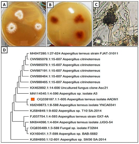 Morphological and molecular identification of A. terreus (A–D): (A) Colony of A. terreus on PDA; (B) Reverse colony, (C) Light microscope (400×); (D) Phylogenetic tree of the investigated fungus Aspergillus terreus.