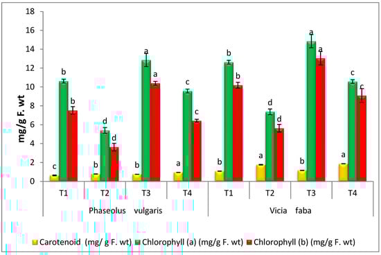 Effect of A. terreus on photosynthetic pigments of R. solani-infected P. vulgaris and V. faba seedlings. T1 = Healthy control; T2 = Infected control; T3 = Healthy with A. terreus, and T4 = Infected with A. terreus. Data are presented as means ± SD (n = 3). Data are from the LSD test at p ≤ 0.05. (a, b, c and d: symbols of significance letters).