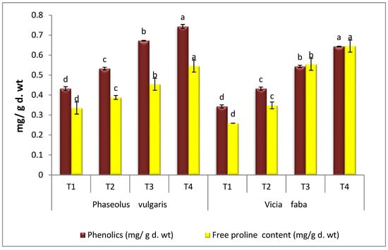 Effect of A. terreus on phenolics and free proline content of Rhizoctonia solani-infected P. vulgaris and V. faba plants. T1 = Healthy control; T2 = Infected control; T3 = Healthy with A. terreus, and T4 = Infected with A. terreus. Data are presented as means ± SD (n = 3). Data are from the LSD test at p ≤ 0.05. (a, b, c and d: symbols of significance letters).